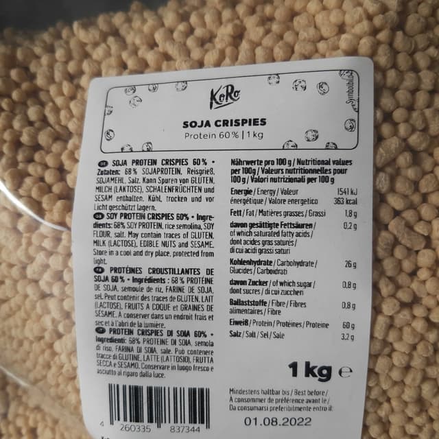 Crispies croccanti dal sapore neutro e dai valori nutrizionali ottimi (60% di proteine). Vanno benissimo sia con i dolci tipo yogurt e bevande vegetali (io li mangio spesso con lo yogurt) che nelle zuppe e minestre.