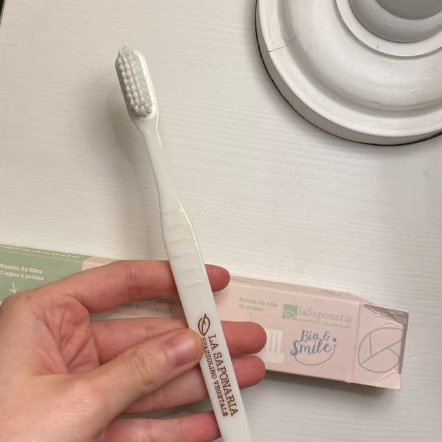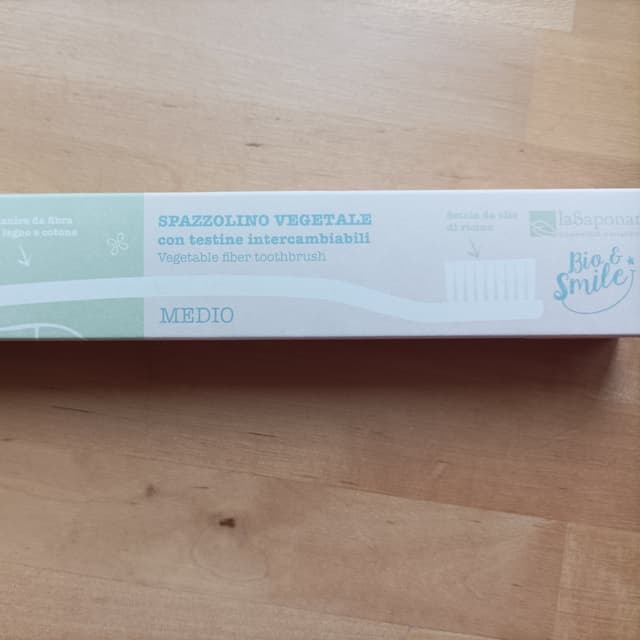 Spazzolino vegetale setole medie di la saponaria. Allora, mi sono trovata molto bene, prezzo buono, e prezzo delle ricariche ottimo rispetto ad altri brand, non è molto carino esteticamente, ma non è molto importante.