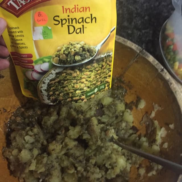 spinach, water, onions, yellow lentils, tomatoes, sunflower oil, coriander, garlic, salt, cornstarch, spices, ginger, chilies, cumin, turmeric, and cinnamon