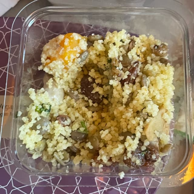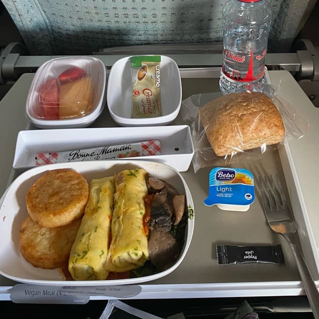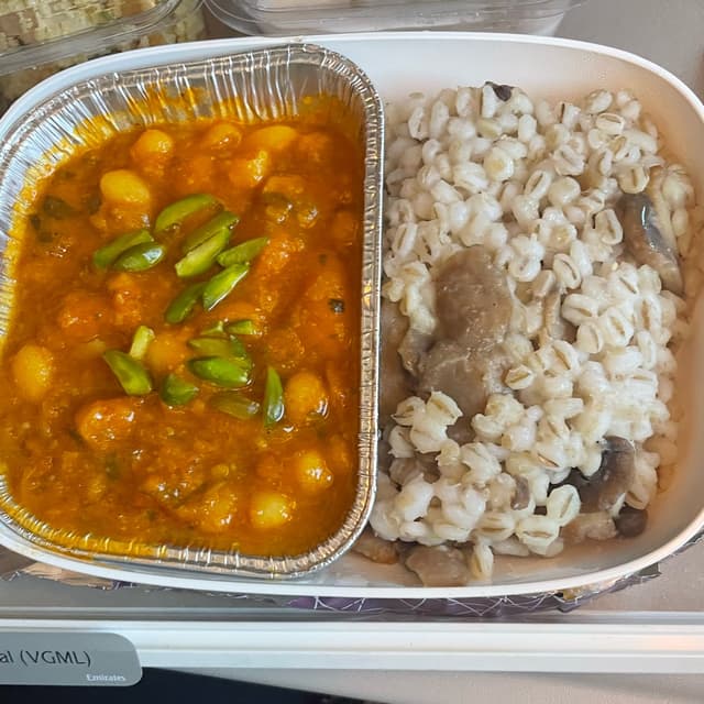 Appetiser Cous cous salad with mushrooms, peaches and raisins. This was quite pleasant. Would’ve been nice with a bit of a crunch from nuts. Main meal Vegan white bean stew with barley. I was shocked at how tasty this was. The stew was very flavourful. Dessert I think this was rice pudding with some sort of fruit and pistachios. It was very sweet so I couldn’t finish it all. Overall I was very impressed with the quality and variety of food. #emirates #airplanefood #stew #couscous #aeroplanefood