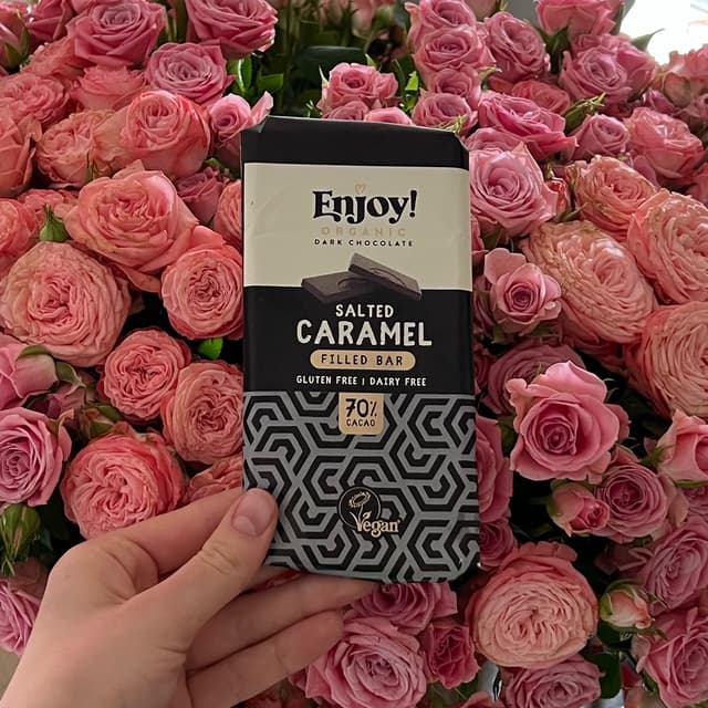 70% cacao chocolate filled with salted caramel 😻 Extremely good! 329 kcal per whole bar (70g) #veganisnotscary #veganchocolate #londoneats #veganchocolatebar