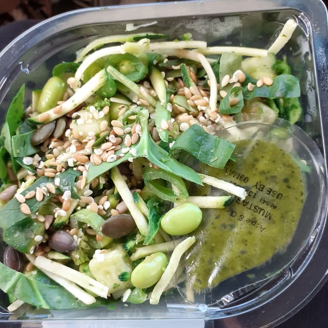 A welcome sight after a weekend away eating the general offerings in village pubs of Plant burgers and fried food. I was craving salad and veggies and luckily in a service station on the long journey home, I found this. Cucumber, Edamame beans, apple pieces with a spicy, sharp ginger sauce. It was lovely, tasted fresh and sharp. Expensive doesn't even cover it but it was a service station. A thumbs up though as a quick snack.