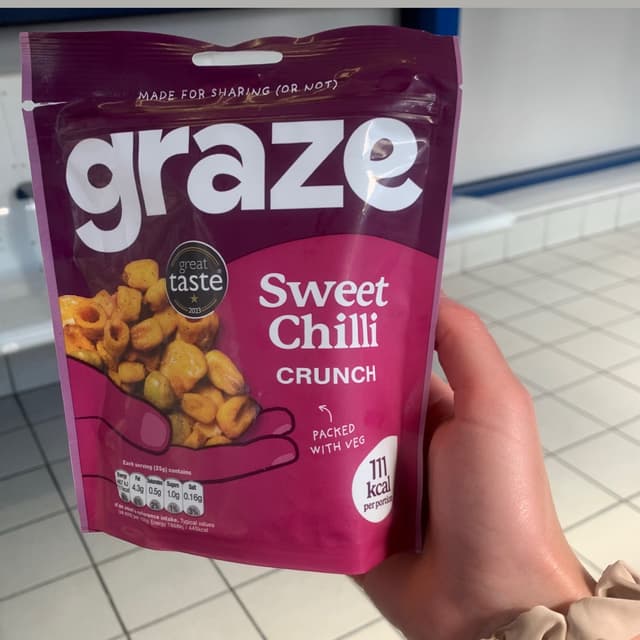 Omg this is sooo nice. A little bit oily to touch but has rlly lovely umami and sweetness to it. The sweet chilli flavour is so nice, a little tingle of spice and sugar. Very crunchie too, little tiny cute bits. Great snack to have! Lots of cayane pepper, broad according to my classmate lol. Made for sharing or not loul, sho founi. 4/3/24 13:28 #graze #snack #vegansnacks #snacks #sweetchilli #corn #crunchy #teamcrunchy #crunch