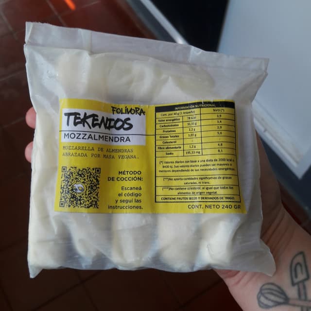Pack de 6 unidades de Tequeños de mozzarella a base de almendras abrazada por masa vegana. Harina de trigo 000. Peso individual por Tequenio: 40 gr. PRODUCTO CONGELADO / PACKAGING BIODEGRADABLE (COMPOSTABLE)