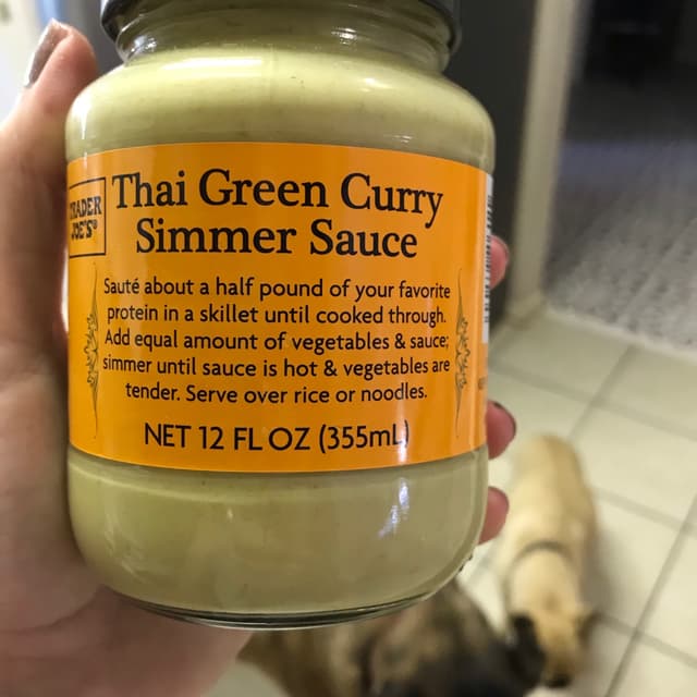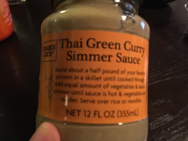 For many years, we carried a green curry simmer sauce on our shelves. It was good, as sauces go, but it never really set the world on fire. You see, this sauce had a bit of an identity crisis. It contained some nontraditional ingredients, along with gums, soy, and wheat. So, we set out to create a sauce that would exceed expectations, full of zesty green curry flavor—and in doing so, we were able to provide a better value for our customers. Yay! Without further adieu, allow us to reintroduce Trader Joe’s Thai Green Curry Simmer Sauce. Our Product Innovator went straight to the source in Thailand to create this Thai Green Curry Simmer Sauce. It starts with a base of velvety coconut milk, and an incredibly flavorful, spicy green curry paste. Packed into this paste are shallots, lemongrass, garlic, galangal, coriander seed, Thai lime peel, ginger, turmeric and cumin—all contributing to its savory, aromatic awesomeness. The Sauce is rounded out with rice bran oil, sugar, basil leaf and green chili for just the right amount of heat.