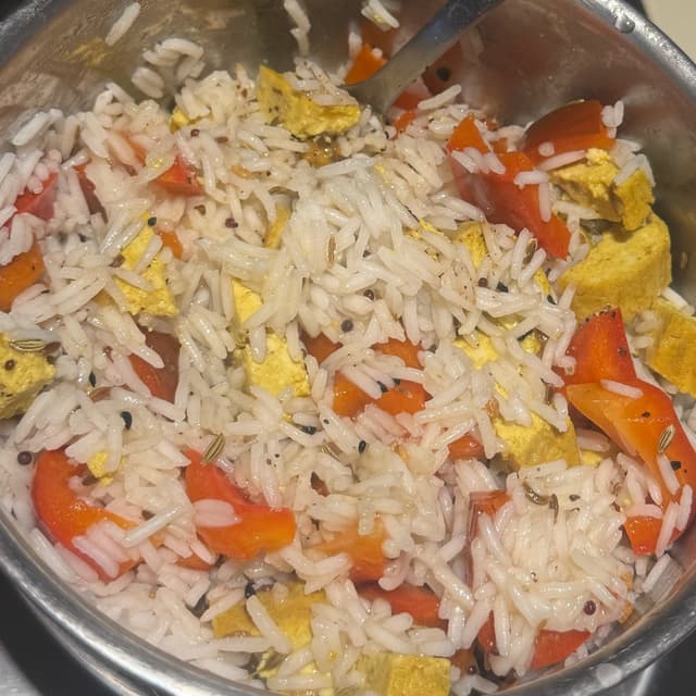 I had read a few positive reviews of this #firmtofu so wanted to try. I braved the heat and cooked rice 🥵 with bell peppers 🫑 and tossed in diced tofu and my 5-seed mix. after the foto, i added a little turmeric. it was very good. #taifun is my favorite #tofu. I am not a big fan of tofu but I love their products. I prefer some of their other products more but this was good. It kind of has a sweet and bitter flavor. their other flavors I will eat straight from the package before I have a chance to add them to a meal. 😊 #wheredoyougetyourprotein and me, trying to get a little work done. 😂 #catsofabillion