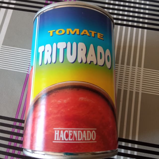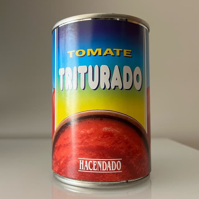 Tomate triturado básico y con solo dos ingtedientes: tomate y acido cítrico. Envase reciclable. Yo suelo quitarle el papel y aplastar las latas para que no haga daño a nadie. 0,99 € en Mercadona.
