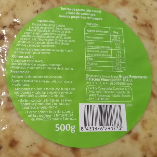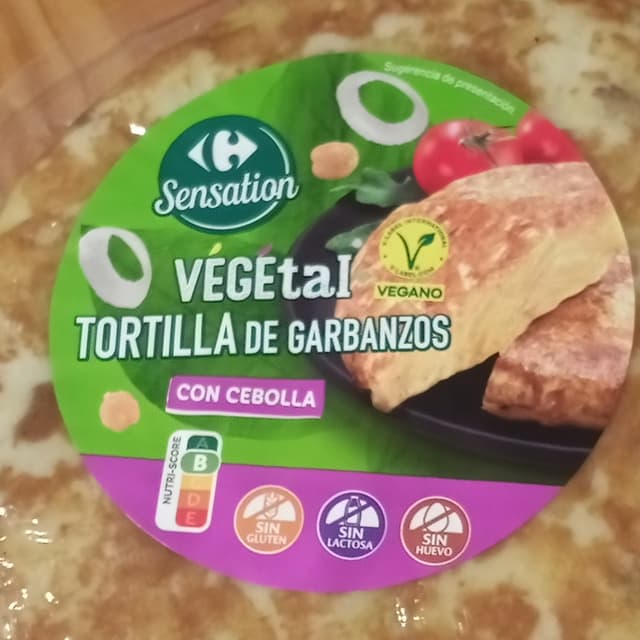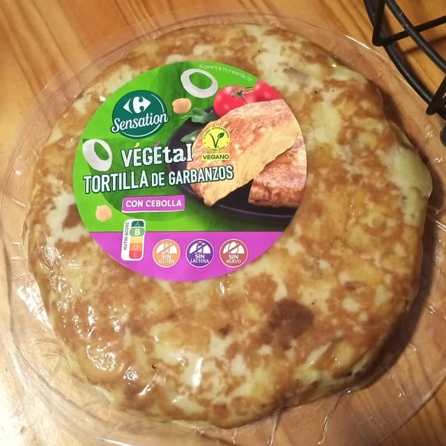 Tortilla de papas con cebolla, sin menstruaciones de gallinas (expelidas por su conducto cloacal, el mismo por donde excreta los excrementos). Nunca me gustaron mucho este tipo de tortillas industriales, pero es genial que saquen versiones sin tortura y muerte de animales. Lo ridículo es que le llamen "Tortilla de garbanzos" 😒😒.