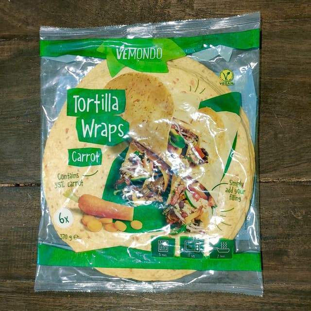The tortilla wraps carrot is a food product made from a blend of 35% carrot and 55% wheat flour. It has a vibrant color and a soft, pliable texture that is easy to work with. These wraps can be used to make sandwiches or wraps and are a popular choice for people looking for a tasty and convenient meal option. Some customers have reported enjoying the unique flavor and texture of these wraps, while others have noted their versatility in creating various dishes.