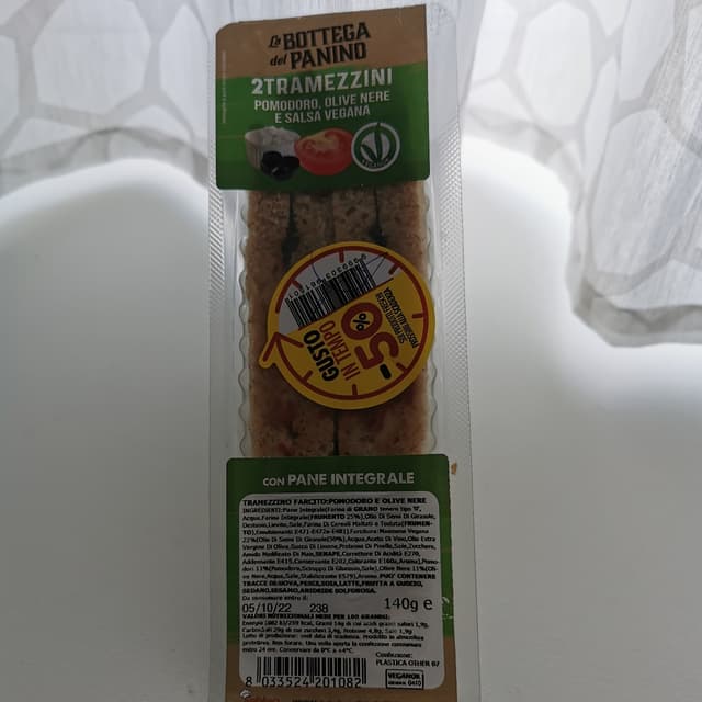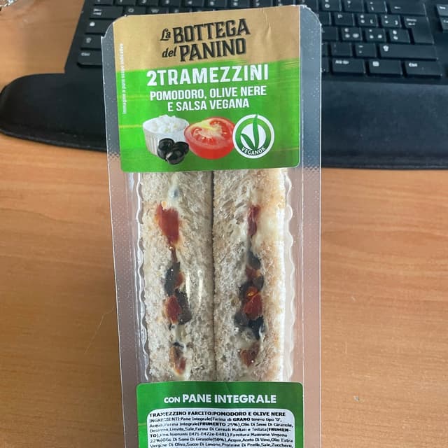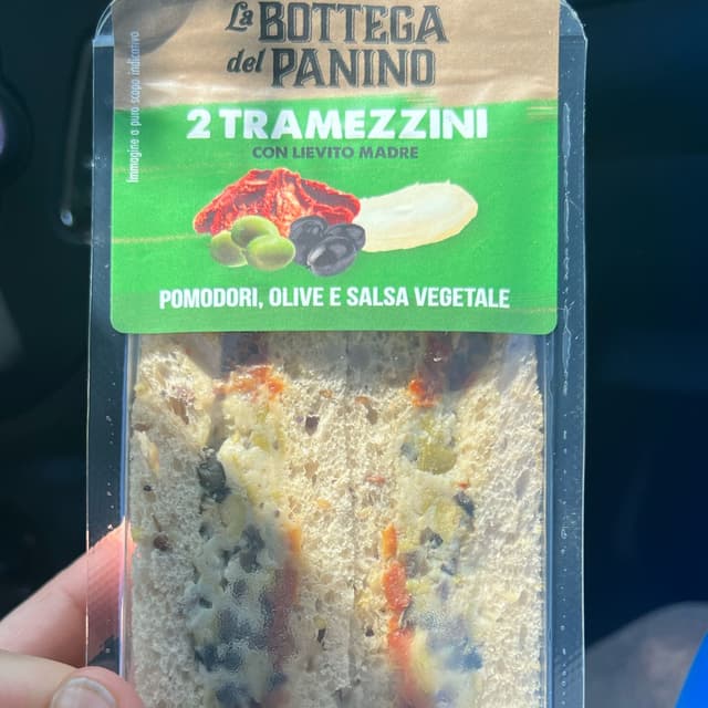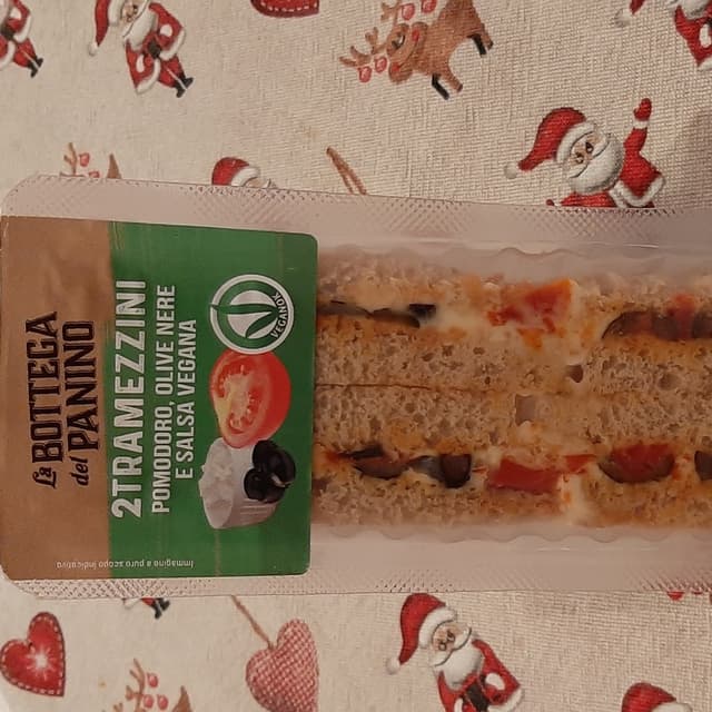 Tramezzini con pomodori secchi, olive nere e una salsa vegana. Il condimento è bello ricco. Il tramezzino mi è piaciuto tanto, il migliore tramezzino vegano mai provato.
