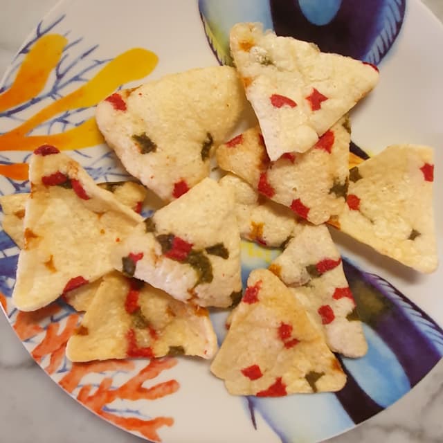 Con pochi ingredienti (fiocchi di patata, farina di riso, olio di mais, ortaggi e sale) e il fatto che non siano fritti sono un "golosesso" che possiamo perdonaci. Buona la consistenza, le verdure non si sentono molto ma fanno da soli una ciotola per l'aperitivo molto coreografica