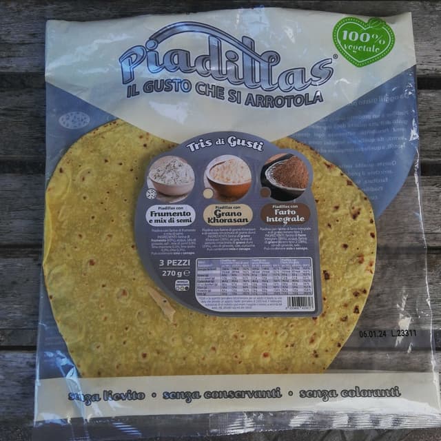 Tre piadine di tre diversi gusti. Frumento e mix di semi, grano khorasan, farro integrale una più buona dell'altra! Il sapore è delicato e si arrotola facilmente. #senzalievito #senzaconservanti #senzacoloranti #100%vegetale #lazyvegan #piadinavegetale