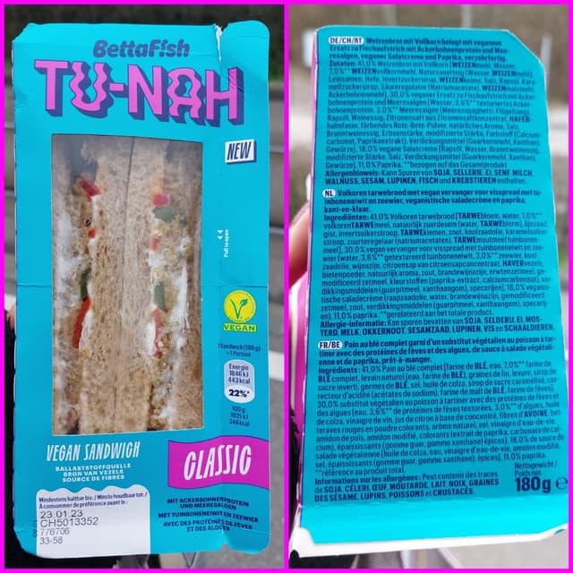 When I started being a vegetarian 16 years ago, it was so difficult to find nice food I could eat, especially when in a hurry. I'm so glad nowadays it's getting easier and easier to find not only nice but great products, not just vegetarian but even vegan! This Tu-nah #sandwich gave me the possibility to have a decent #lunch while working, without having to bother about the ingredients first. The taste is ok, personally I would prefer less or none pepper in it, but that's so individual and I won't remove a star because of my personal taste preferences. The vegan "tuna" is not so strong as others I tried, what I really appreciated. And the packaging is ♻️ #recyclable, you just have to remove a thin sheet of plastic, so the cardboard box is not oily at all. It was not so easy though and I'm afraid a lot of people won't even try to remove it, but in the end I had the lucky feeling I won a hard task :) P.S. as I was trusting the yellow lable and really had to hasten, I didn't check the ingredients. Now I see that there may are traces of fish...can the product still be declared as a vegan one?!