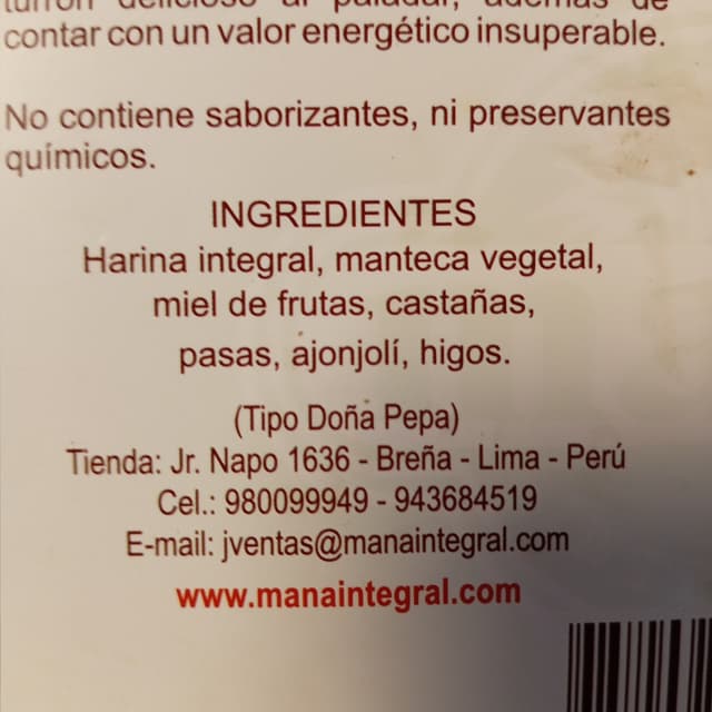 Cuesta 9.90 soles y tiene un peso de 250 gramos. Pensé que sería seco por ser integral pero tiene muy buen sabor. No lleva miel de abeja sino miel de frutas. Es tipo doña pepa, está hecho con harina integral, manteca vegetal, castañas, pasas, ajonjolí e higos. No lleva saborizantes ni preservantes.