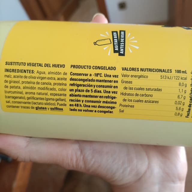 Producto liquido que simula el huevo. Ideal para pastelería, tortillas... Nutricionalment bastante bien, sabor correcto, pero a mí me cuesta cocinarlo. Tengo que seguir practicando. De precio es caro. A mí me costó la botella grande 12€.
