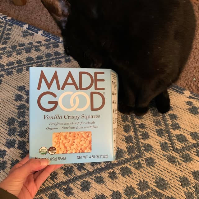 my sis got these Made Good Crispy Squares to try and she likes them but like the other things from this brand, i just think the flavor is boring- definitely better vegan rice krispy treats out there. 🌾