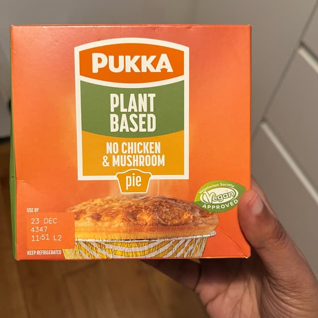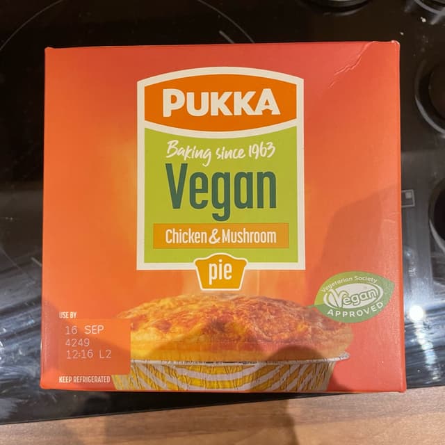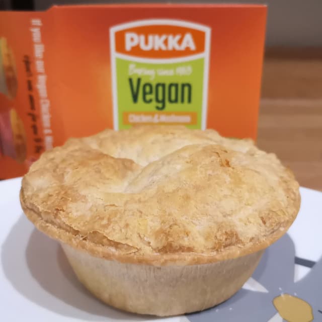To me this tastes just like the non-vegan pies. the filling is mostly sauce, with small pieces of #veganchicken and #mushroom. It doesn’t taste amazingly high quality but it does feel equal to their other non-vegan pies so that’s not a huge dig. Good for an easy, filling meal if you miss this sort of thing! #pie #lazyvegan