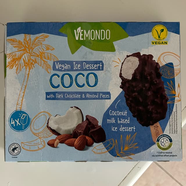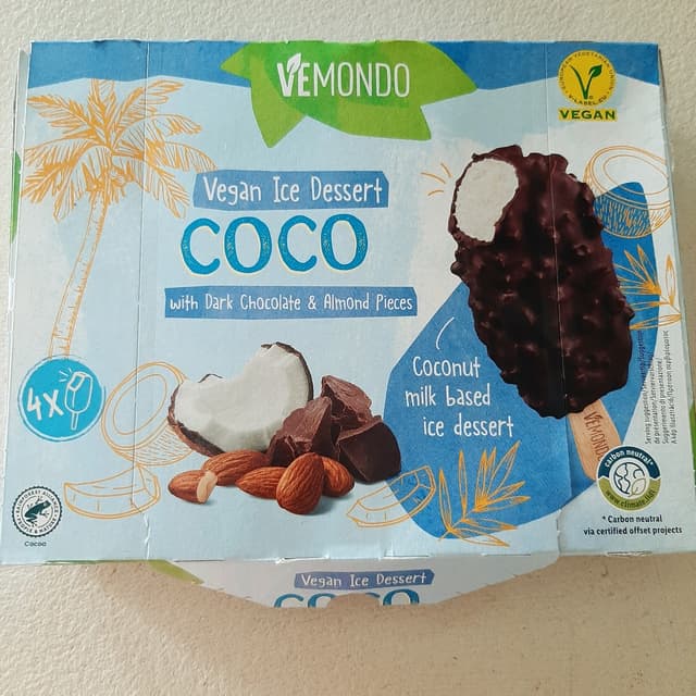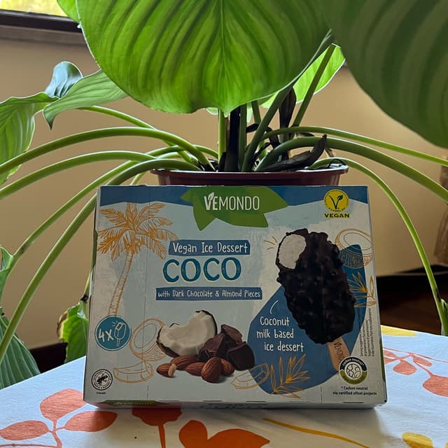 Una delusione! 😞 Forse le aspettative erano troppo alte. Gelato a base di latte di cocco ricoperto di cioccolato amaro e pezzi di mandorle. La copertura proprio non mi è piaciuta, il cioccolato sa di cacao di scarsa qualità, è amaro ma manca di morbidezza nel gusto che anche i cioccalati fondenti hanno. L'interno non è malissimo ma rimane un po' vuoto, acquoso, manca di cremosità ed è poco "coccoso". Probabilmente il latte di cocco usato è leggero e poi ce n'è solo il 13 %.