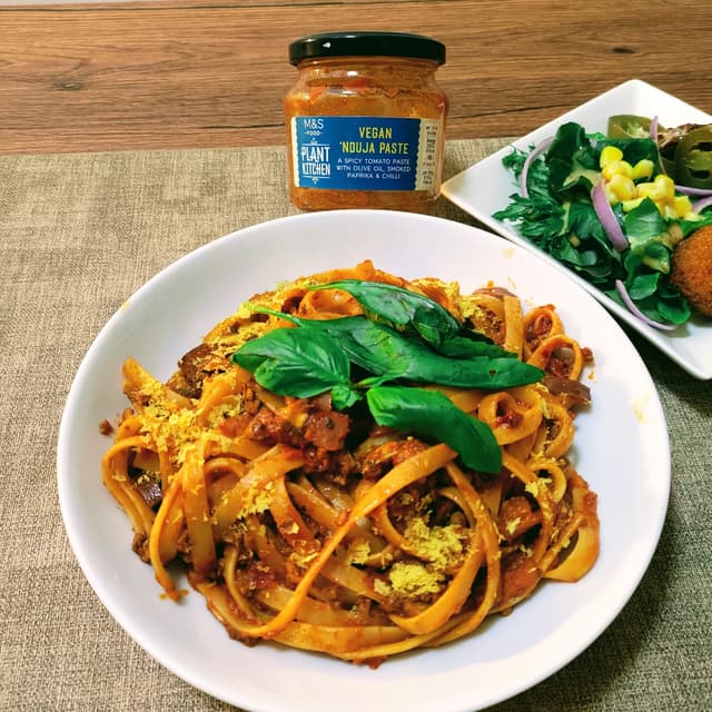 Richly #spicy and #tomato heavy #nduja paste. It's not quite a pasta sauce but I decided to use it that way 😅 I need to add my own fake mince, diced aubergine, and basil in order to give this more texture and bite, but it offered this greasy moisture and fiery colour to the whole plate, so I was happy 🙂 I'm having lots of stuff from Plant Kitchen lately; my food's air miles are almost as bad as mine 😬 And there's more to come