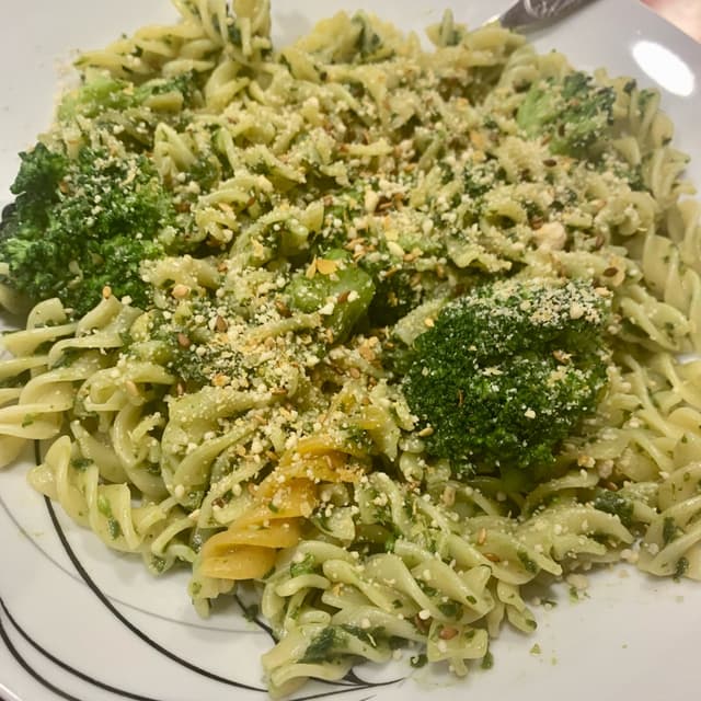 Made this pesto fusili pasta with broccoli and topped with vegan parmesean from jouzourna🤩 #veganisnotscary