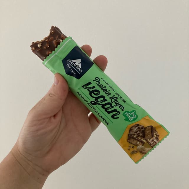 Barretta vegana a base di proteine di soia, riso e piselli + arachidi. Buonissima! sia di gusto sia di consistenza. 24% di proteine. Per me è un ottimo prodotto.
