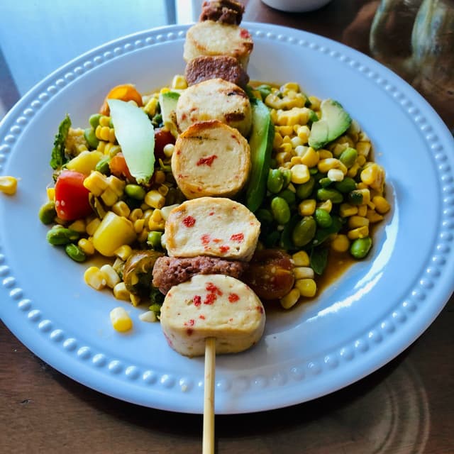 Grilled vegan scallops over a corn and tomato salad fresh from the garden! The scallops were delicious! Even my non-vegan in laws ate them and couldn’t tell the difference from real scallops! I purchased these from It’s All Natural Store in Columbus, OH.