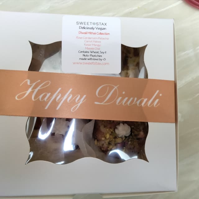 SweetStax produced Diwali festival themed sweets for 2021. These were vegan and very well presented sweets giving a novel alternative to the traditional Indian sweets which are rare to find with vegan ingredients. SweetStax is a female student owned startup in the US. The products reflect a high level of creativity and are great for any special occasions.