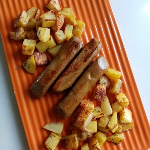 Salsicce a base di tofu e proteina di frumento della Dm. Che scoperta! Buonissime, temevo avessero un gusto strano (di solito non mi piacciono i simil salsiccia/wurstel) ma queste erano proprio buono. Anche la consistenza soffice e per nulla plasticosa. Gustose con la giusta dose di erbette aromatiche. Le riprenderò!