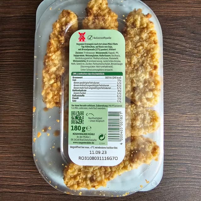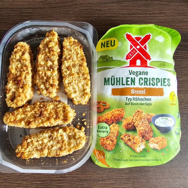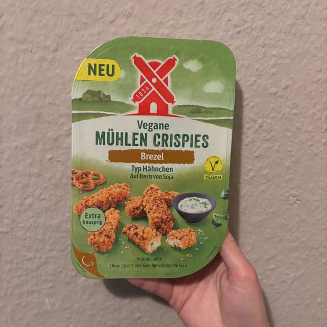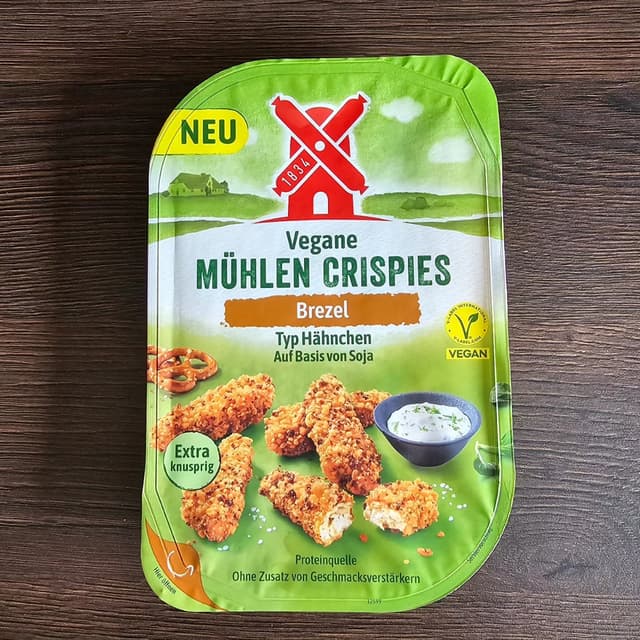 Rügenwalder Mühle Vegane Mühlen Crispies Brezel Diese Crispies schmecken wirklich sehr lecker! Sie sind sehr nah am original. Sowohl knusprig, als auch zart. Man kann sogar das leicht salziges Laugen Gebäck der Panade herausschmecken
