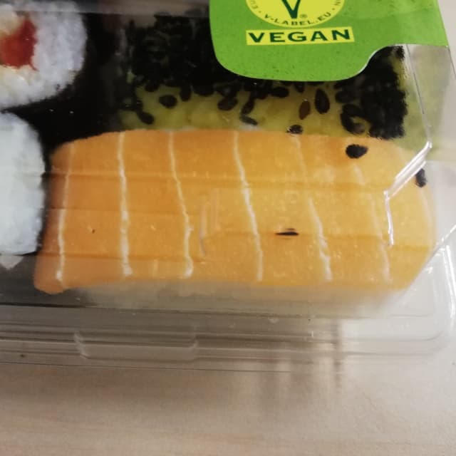 -9 vegan sushi specialties, 3 nigiris: 2 with vegan fish slices made from tapioca starch - salmon type, 1 with yellow colored rice, ginger preparation and sesame, available from Rewe to go -9 vegane Sushispezialitäten, 3 Nigiris: 2 mit veganer Fischschnitte aus Tapiokastärke - Typ Lachs, 1 mit gelb gefärbtem Reis, Ingwerzubereitung und Sesam, erhältlich bei Rewe to go