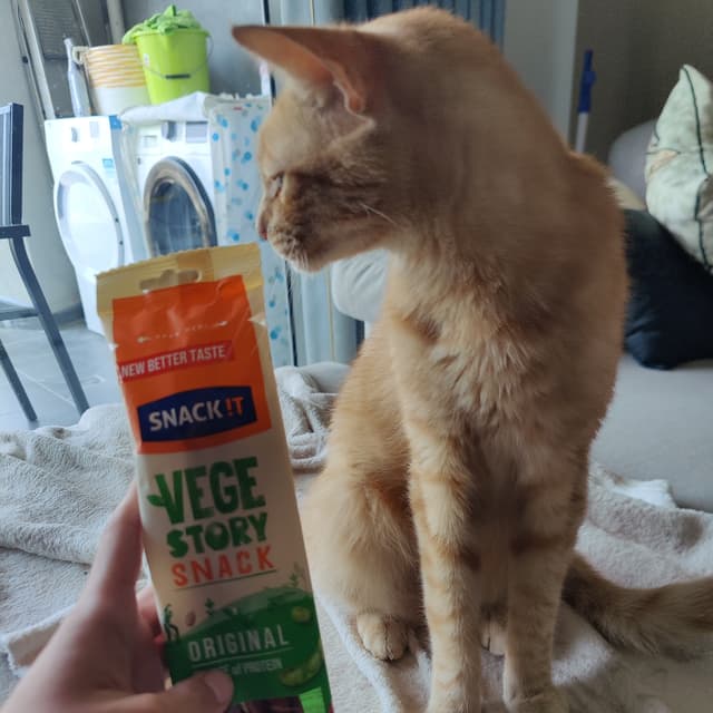 Couldn't resist heading to Nugget again to take the picture. It's just too cute how she reacts to it 😸 This is really yummy, think I had it all finished on the same day I opened it 🤭 It's pretty much how I remember the original when it comes to consistency and taste. This could be a bit inaccurate, cause I didn't have them for quite a long time now. Either way they are a really good #snack 😋 #abillion #veganin2025 #veganfood #malta #maltavegan #veganmalta #ifitsnotveganitsnotfood #veganisnotscary #veganproud #vegan #snackit #vegetale #original