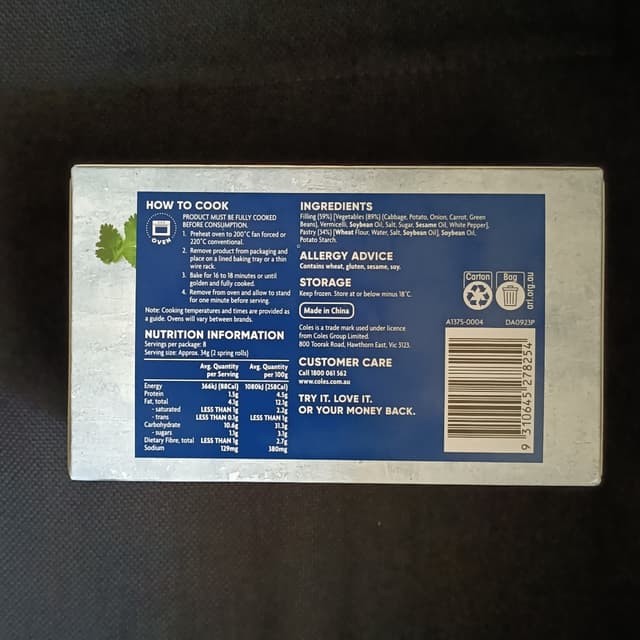Little golden spring rolls from the frozen section. Better value for price compared to other veg spring rolls - I got the smaller pack of 16 rolls for $1.85, but there's a 60 rolls/ 1 kg/ $6.60 bulk option too.... haha. Uses soybean oil instead of palm oil. Overall a mild pleasant taste best accompanied by a sauce of your choice. Microwaveable if you so desire but at the cost of crispiness. Vegetable filling is mostly cabbage, potato, and carrot.