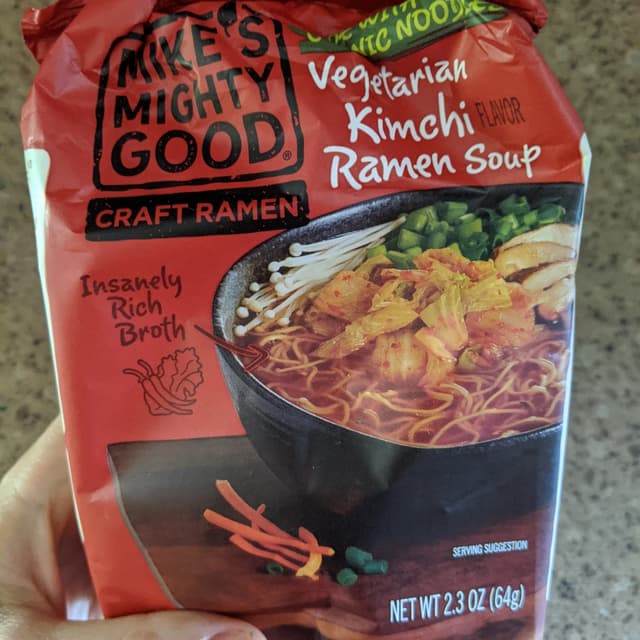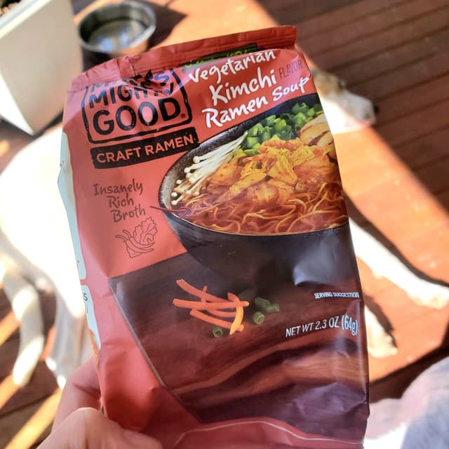 I really enjoyed this #ramen and will definitely buy it again! The broth was rich like the packet says 😋, with the perfect amount of heat to it. I added some veggies and fresh #kimchi to make it a meal, and it ended up being very satisfying. My only critique is that I wish there were more noodles. They stayed nice and firm and had a good flavor. (Without the stuff I added, this probably would have been a very light meal.) Looking forward to trying the other vegan flavors from this brand.