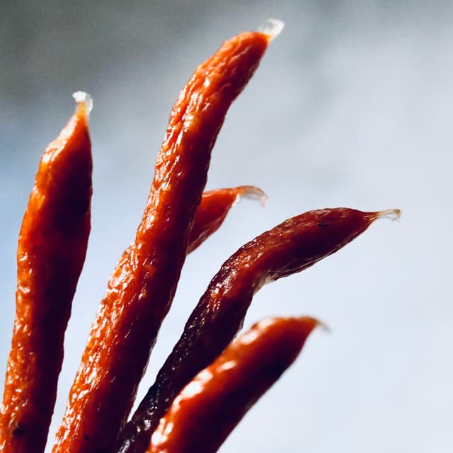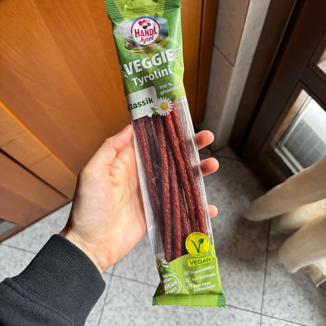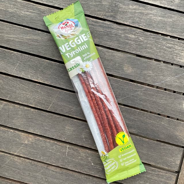 Trovati casualmente in aeroporto, la consistenza è più morbida dell'equivalente carnivoro, ma a parte un vago retrogusto di soia il sapore è ottimo e molto vicino all'originale. Consigliato come snack al volo