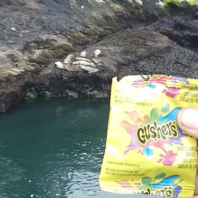 🦭 #sealsofabillion and @paniwilson's dirty fingernails 🤣 We also saw two whales 🐋🐋 unsettlingly close to the shore during the tsunami warning 🌊🚨 💦 Gushers! What 90's kid does not love them?! The #watermelon 🍉 and #sourapple 🍏 flavors are delish! One of our favorite #accidentallyvegan snacks! #veganisnotscary #veganin2025 #sweettooth #candy #vegancandy #reviewwithaview