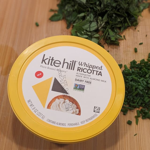 As with all Kite Hill products l, this was very delicious! It had the right amount of salt and flavor. I was expecting a fluffy, creamy texture, but it was more firm and not very soft. The texture could definitely be improved upon. #vegancheese
