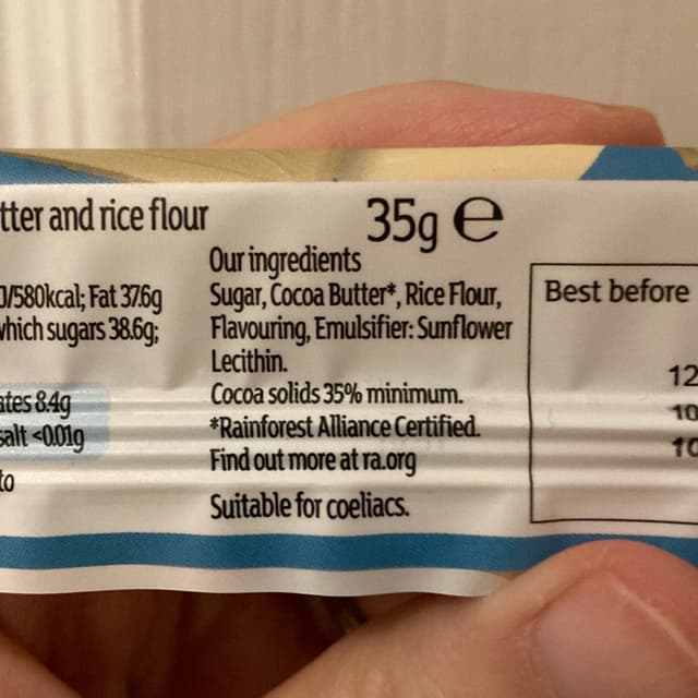 Used this to make vegan whipped ganache, but it didn’t really work like I hoped it would 🤷🏻 Maybe because of the rice flour? After research, that seems like a standard practice for vegan white chocolate. It melted fine but I guess you can’t sub cow milk white chocolate with vegan ones for certain recipes (or maybe the amount needs to be changed). Lesson learned! Also I needed it right away so I bought it, but 55p for 35 grams of this was a lot for me 😭
