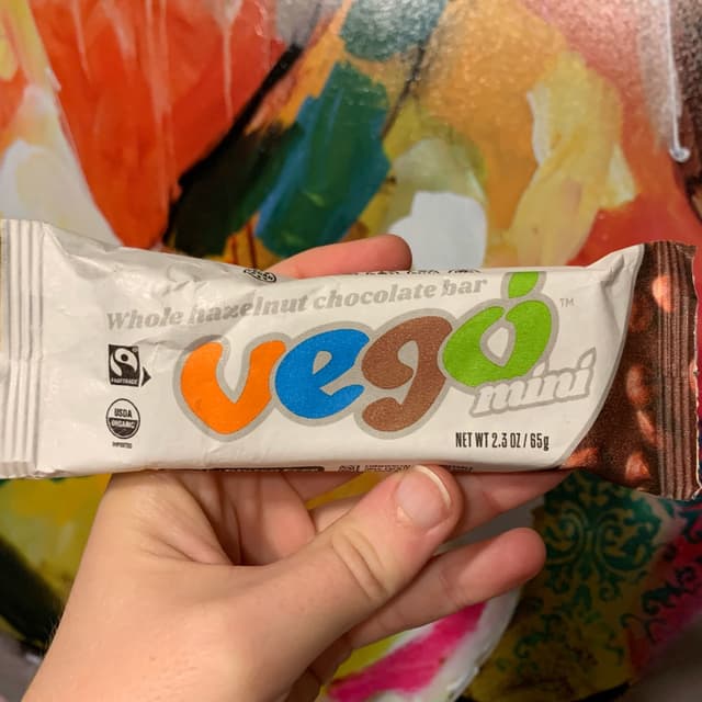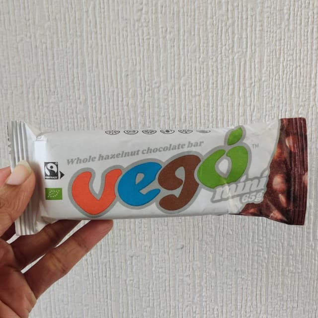 Well this is the same classic Vego - there’s a lot of chocolate here, nothing mini about it, with a few whole hazelnuts mixed in for good measure. The taste is smoother than dark chocolate, but definitely on that flavour side. It’s both organic and fairtrade, which is awesome, and it also has a paper wrapper! Very cool. All in all it’s ok, just not amazing
