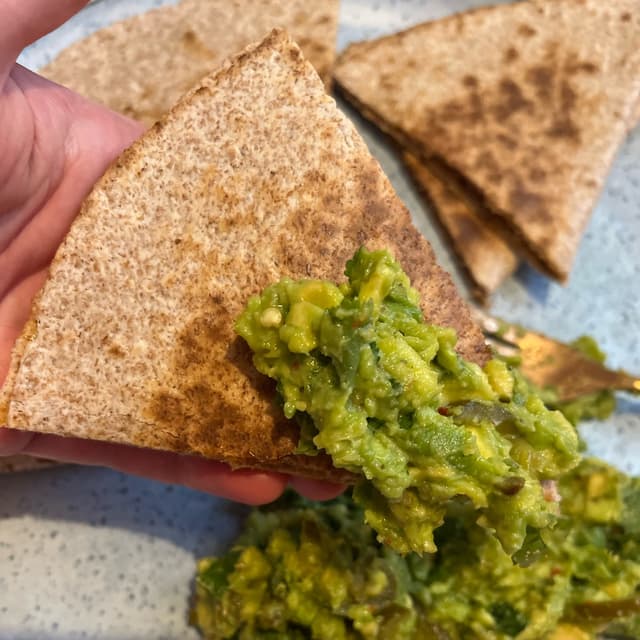 These are one of our go-to tortillas for a good wrap. Basic but crisps up nicely in the oven or dry pan frying. Good just warm as well and doesn’t tear easily, which is good when you pack food in wraps the way we do! Pictured here as a quesadilla filled with Tesco shredded vegan cheese and topped with homemade guacamole and cholula hot sauce! Deeeelicious! #tesco #wrap #tortilla #yum #quesadilla