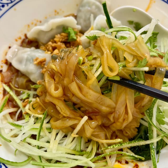 Ziggy Radiobearhá 2 anosVer TraduçãoThin hor fun noodles tossed in black sauce and chilli oil. Sauce was a little on the sweet side. Four to five dumplings with filling of black fungus, veggies and tofu bits. Dumpling skin was a little thick but acceptable. Garnished with shredded cucumber, coriander and mock fried lard. They gave an additional dish of chilli with chilli oil and chilli seeds. $8.50 for a bowl. Very filling. Overall not bad.0