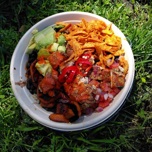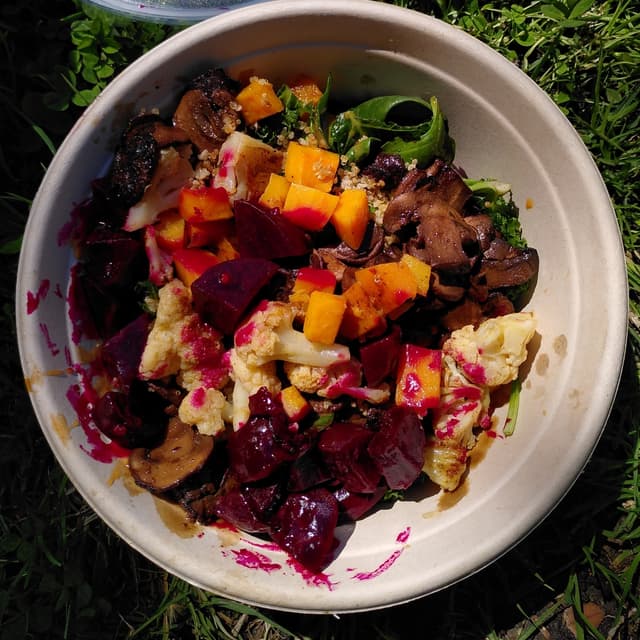 The protein in this dish is the sasame marinated bulgogi beef. I was amazed by it, it's really "beefy" and tasty. The bowl than has kimchi, grains, marinated greens, roasted butternut squash, avocado, pickled cucumber, Korean BBQ sauce. An amazing dish!!