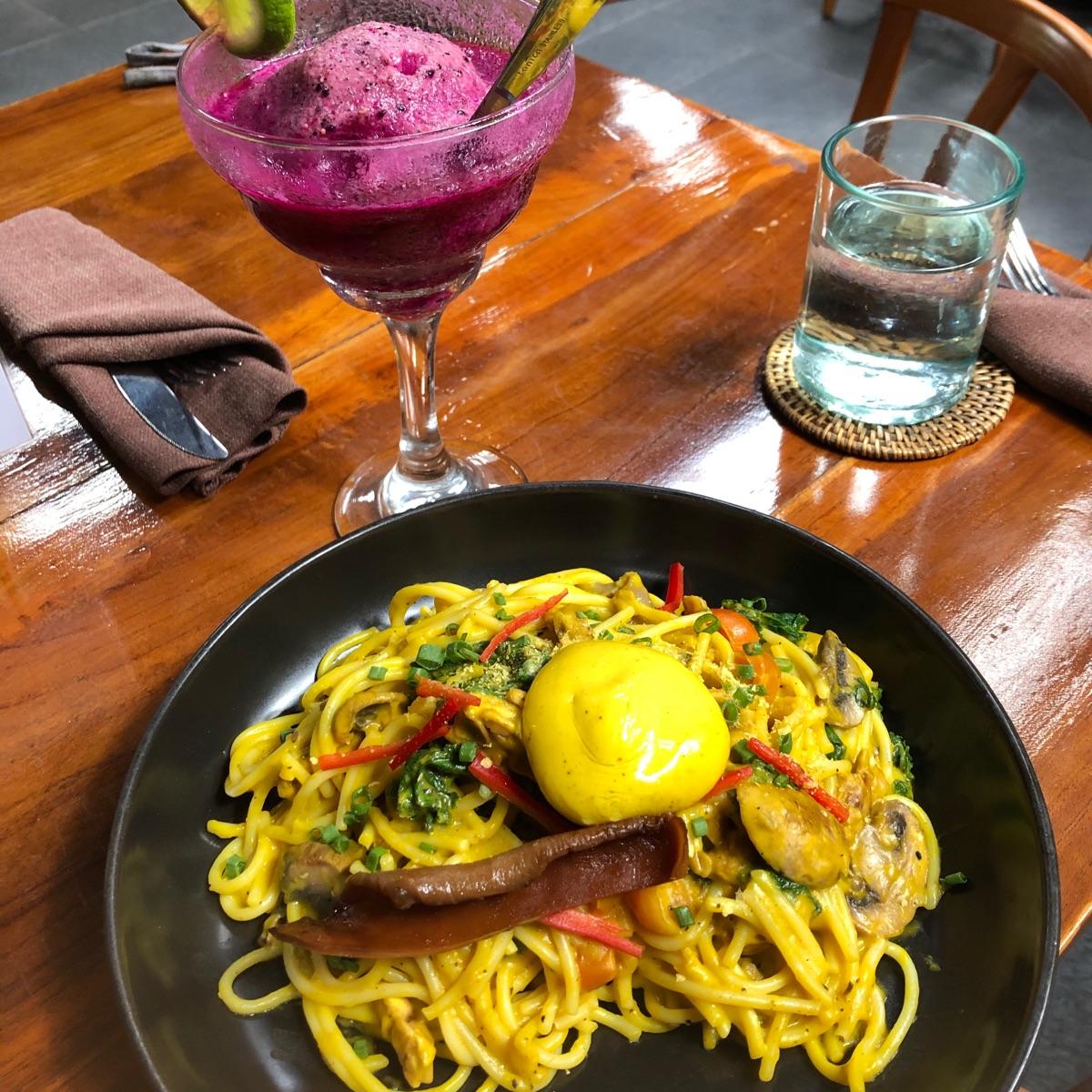 This was so so delicious! The “egg” yolk was very impressive and tasty although it didn’t actually taste like egg, I wonder if they could add some black salt to it. I asked for mushrooms instead of coconut bacon but they gave the bacon as well. I don’t usually like coconut bacon but this was actually quite nice. Pasta was delicious 😋