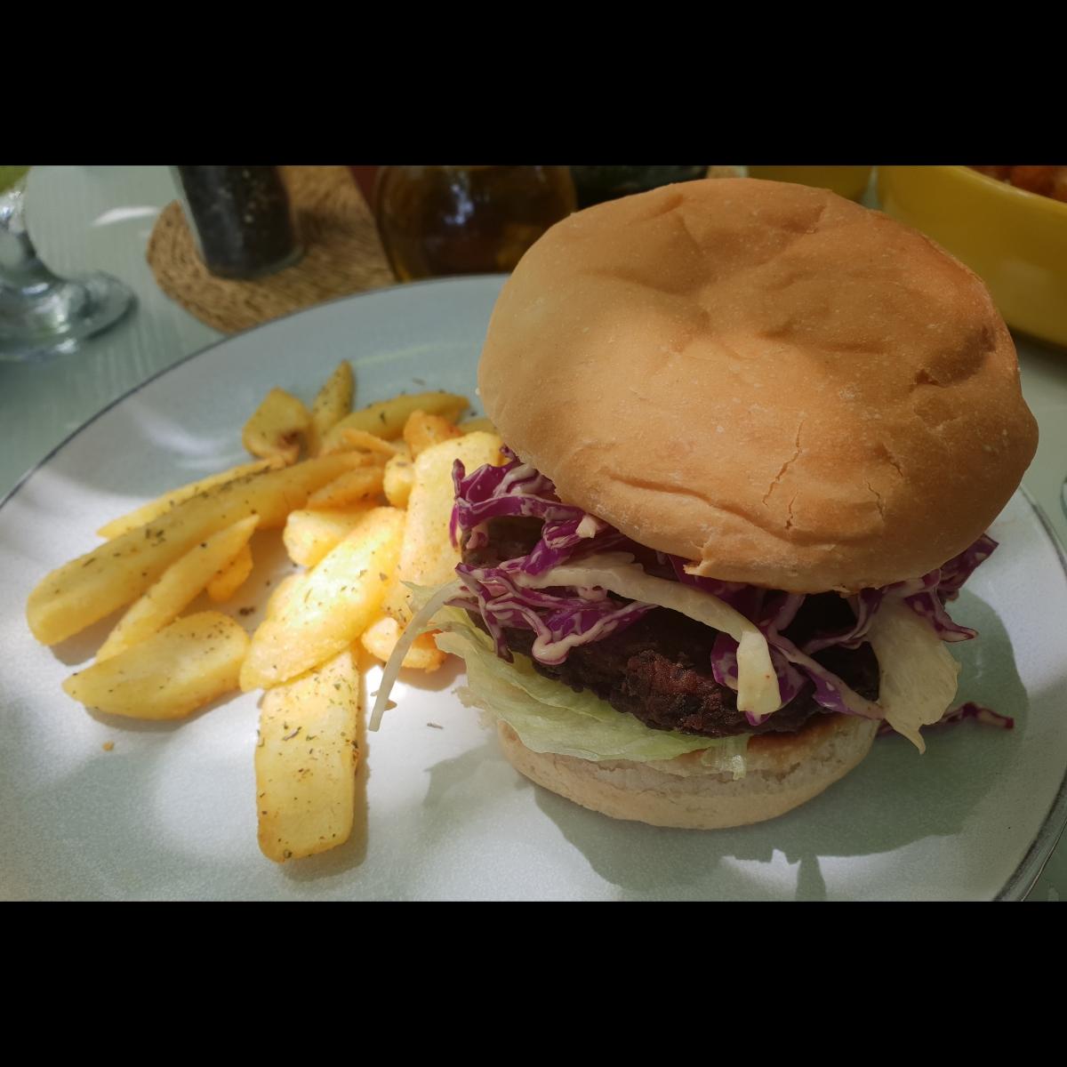 This was a very nice burger. The patty is pretty crispy, flavourful and not as dry as it looks. It also might not look like it, but there is quite a bit of sauce that is very tasty as well. The slaw and the rest of the vegetables also really added to the dish. The chips are crispy and well seasoned. #veganisnotscary