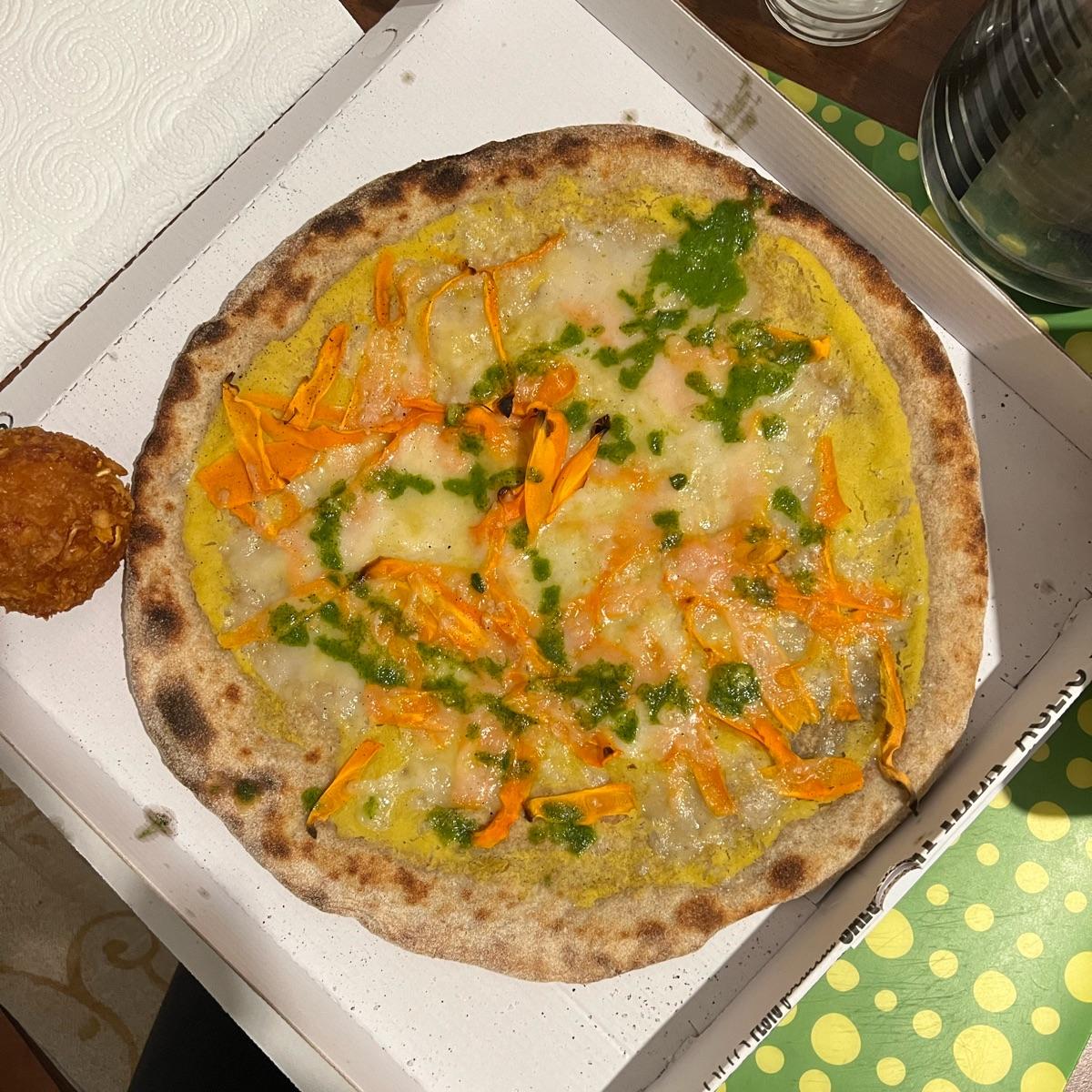 Pizza impasto integrale! Fino a non poco tempo fa era la mia pizza preferita, dopo ne ho assaggiate e scoperte altre di migliori ma ho voluto comunque continuare a far loro una possibilità. C’era una crema gialla dubbiosa e topping verde un po’ strano. Nel complesso era buona ma non so se la riprenderei. Il nome è lo stesso ma gli ingredienti sono cambiati leggermente rispetto all’ultima volta