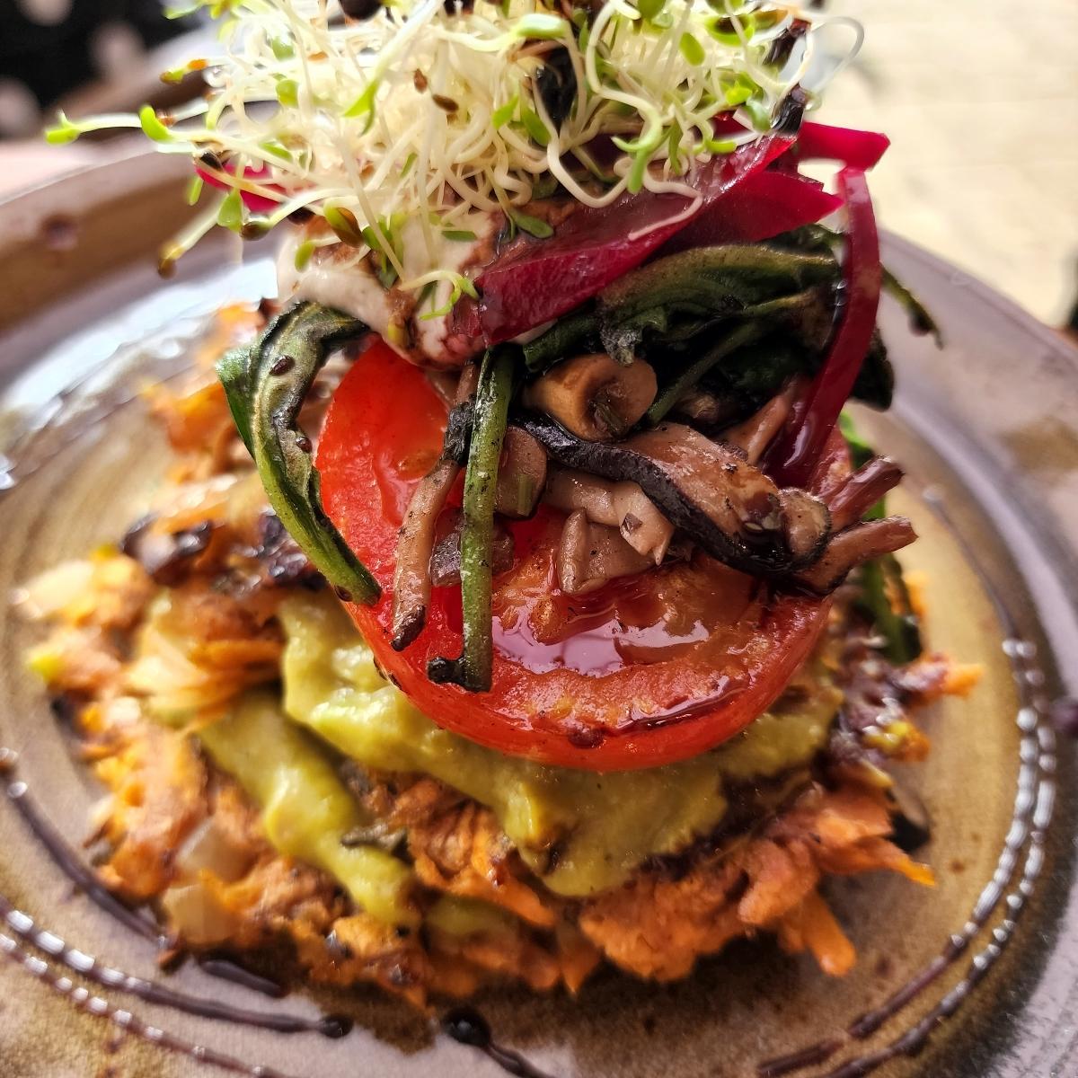 What a lovely presentation. Good combination of tomatoes, spinach, mushroom, and potato hash. Yumm!