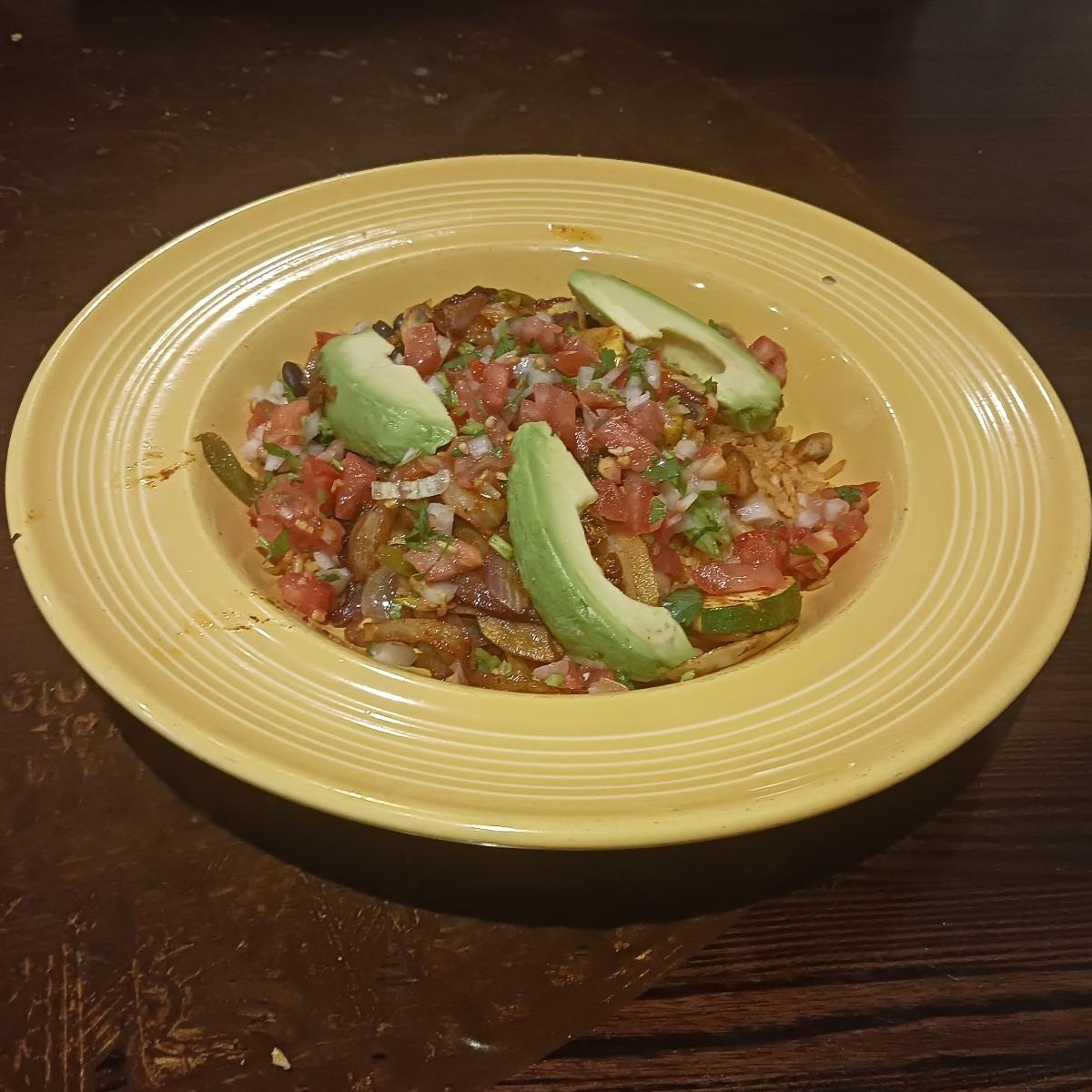 This vegan dish has rice, pinto beans, black beans, squash, mushrooms, caramelized onions, green peppers, fresh cilantro, avocado, and tomatoes. This has been my favorite dish here so far. #avocado #cilantro
