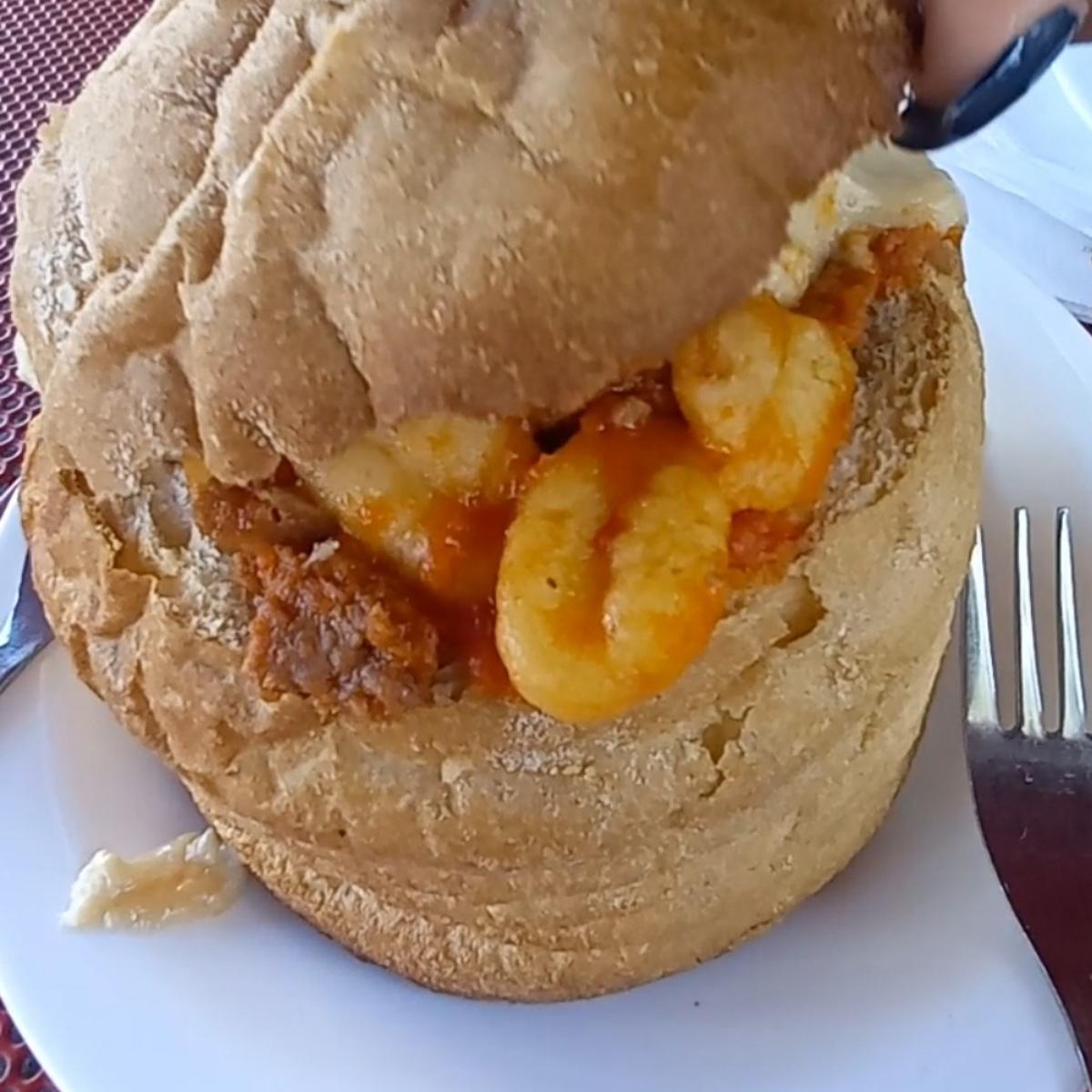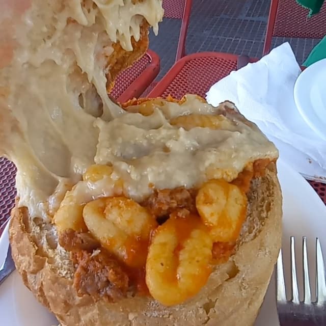 Original volcán de ñoquis en versión vegana. Muy bueno, excelente. Está echo con pan casero, relleno con abundante ñoquis, una rica salsa bolognesa que está echa con hamburguesas not cortadas a cuchillo. Recomendadisimo. Si son de muchísimo comer con un volcán alcanza para dos personas. Lo único que cambiaría es la presentación del local, muy básico y las mesas incómodas. Por el plato nada que decir, lo volvería a comprar.