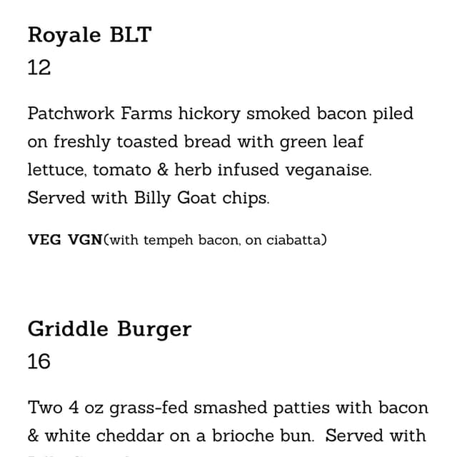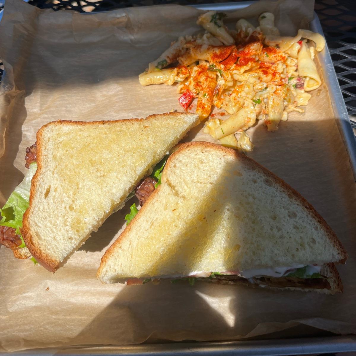 Filling and flavorful. Online it says it comes with Billy Goat Chips but on the menu in person it comes with pasta salad! Was a good surprise. I never liked “real” BLTs but i do really like vegan ones. This is another good one! The bread was nice, toasted, & buttery. Lots of mayo which I love! Pasta salad was pasta salad, nothing too exciting but a good pair with the blt. The patio is a great experience on a Sunday!