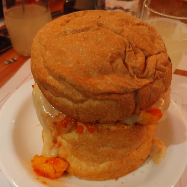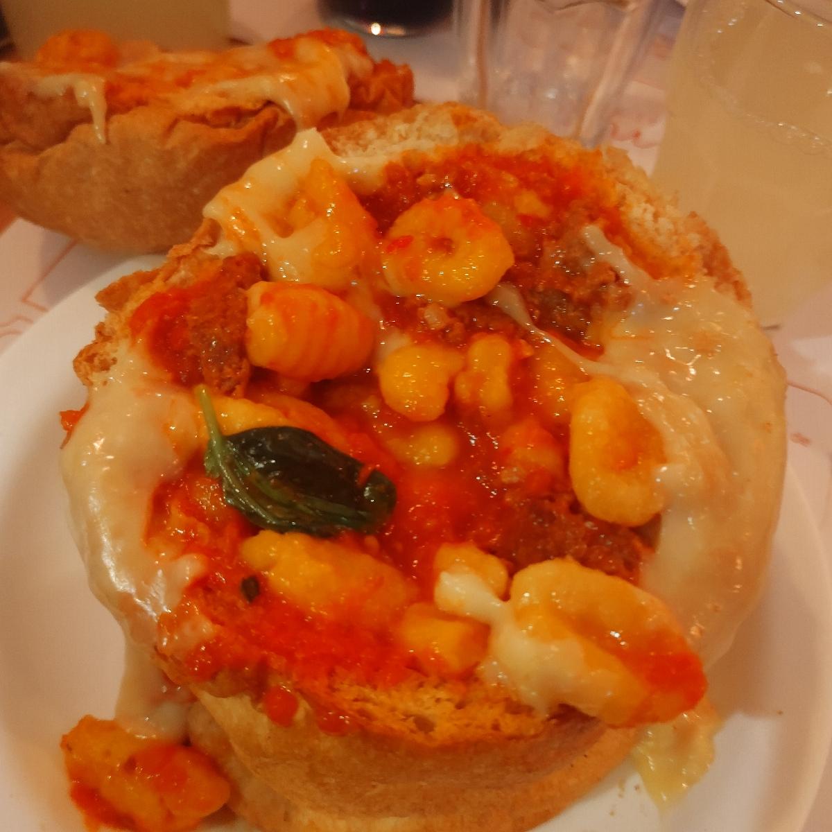 La verdad que me alegra que se empiecen a ver opciones tan copadas 💚 Este plato viene dentro de un pan grande, un poco tostado. Relleno de ñoquis, salsa, hamburguesa y queso NotCo. Lo pediría sin la hamburguesa, sinceramente. Siento que el sabor invade todo. Pero quitando eso, es un platazo. Nadie pudo terminarlo.