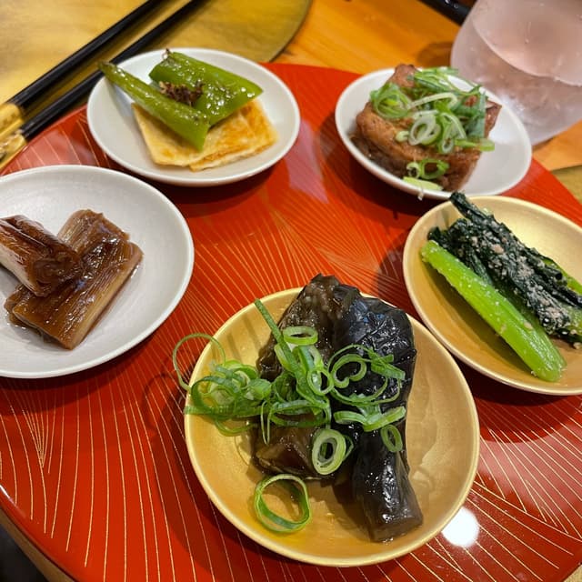 altro piatto dell’izakaya, cinque assaggini di obanzai, nome che indica la cucina di kyoto (semplice, con cibi di scarto / avanzo ecc). c’era uno squisi tofu, buonissime melanzane e un porro caramellato pazzesco. erbette stufate invece ok, così come il peperoncino verde + tofu skin, senza infamia senza lode